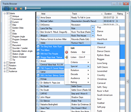 The Browser window allows for fast searching, filtering and editing of the tracks. Tracks can be added to the playlist simply by dragging them from the browser.